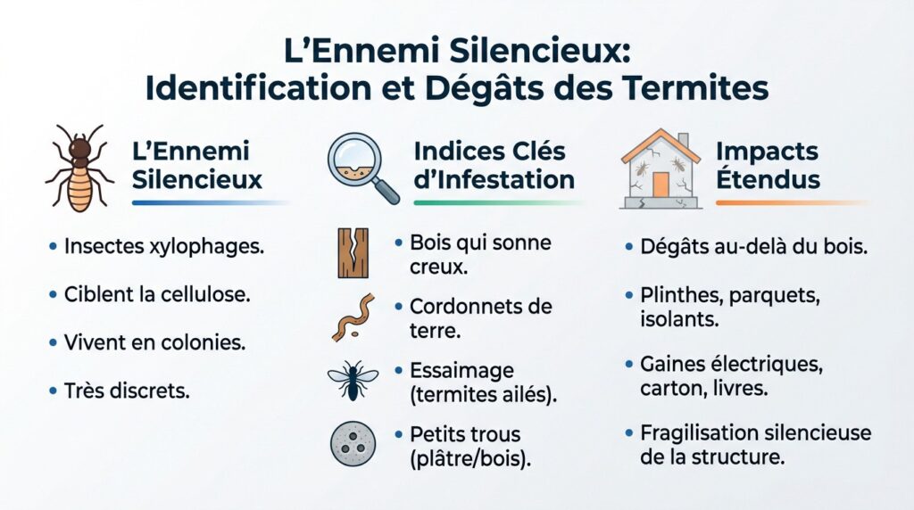 Les termites sont des insectes discrets, mais certains indices permettent de détecter leur présence :
